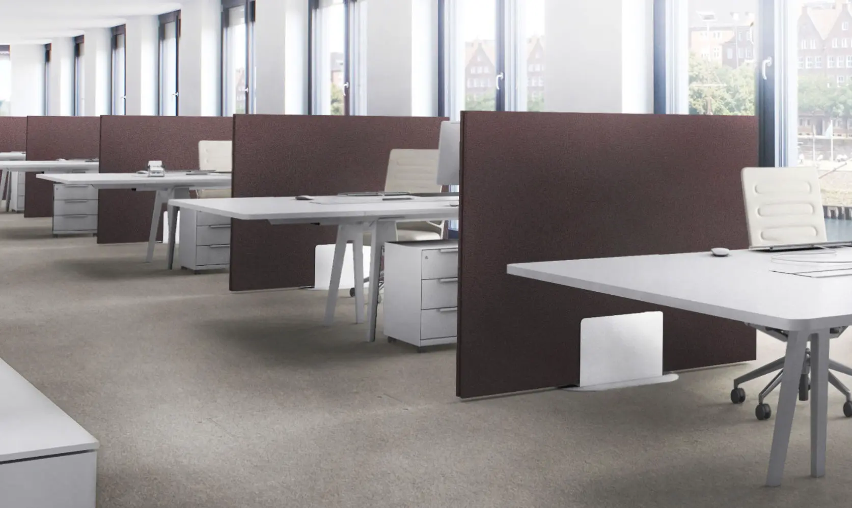 Unsere Akustik-Stellwände reduzieren störende Geräusche zuverlässig und schaffen ruhige Arbeitszonen in offenen Büros.